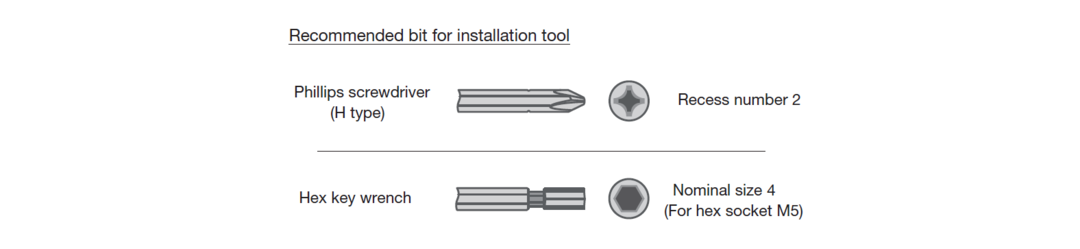 A1: The cross-holes for fastening screws are size No. 2 in JIS B 1012, so please use a screwdriver with a No. 2 bit (Nominal No. 2) and ensure proper engagement between the bit and the screw head during fastening. If you are concerned about the strength of cross recess, we also offer hex socket head screws (bearings with “-JH” at the end of the product name).