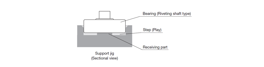 As a precaution when riveting bearings on a steel plate, we recommend that the edge face of the inner race be used as a bearing to prevent the impact of riveting from being applied to the outer race. This is because a shock to the outer race may cause ball indentation inside the bearing and affect its rotational performance. In addition, in case of riveting, the applied shaft may crack after the riveting process, so we would recommend *spin riveting.