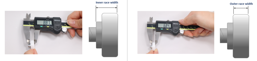 In the case of the following figure, the inner race width is 8.87mm and the outer race width is 6.84mm.